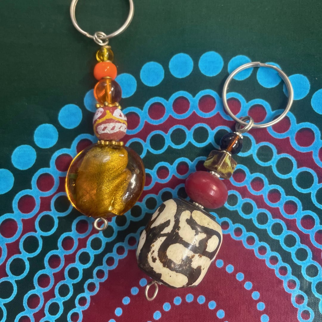 こちらは、茶色と白のマーブル牛骨と、深い赤石がアクセントのキーリングです。